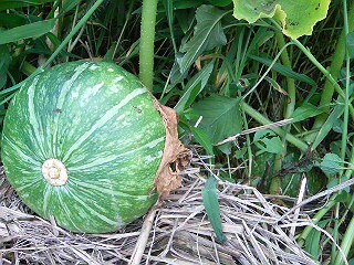 かぼちゃが知らないうちにこんなにでかくなってた。草ぼうぼうでわからなかったので、見つけたときうれしかった! しかももう一つなっていた。
